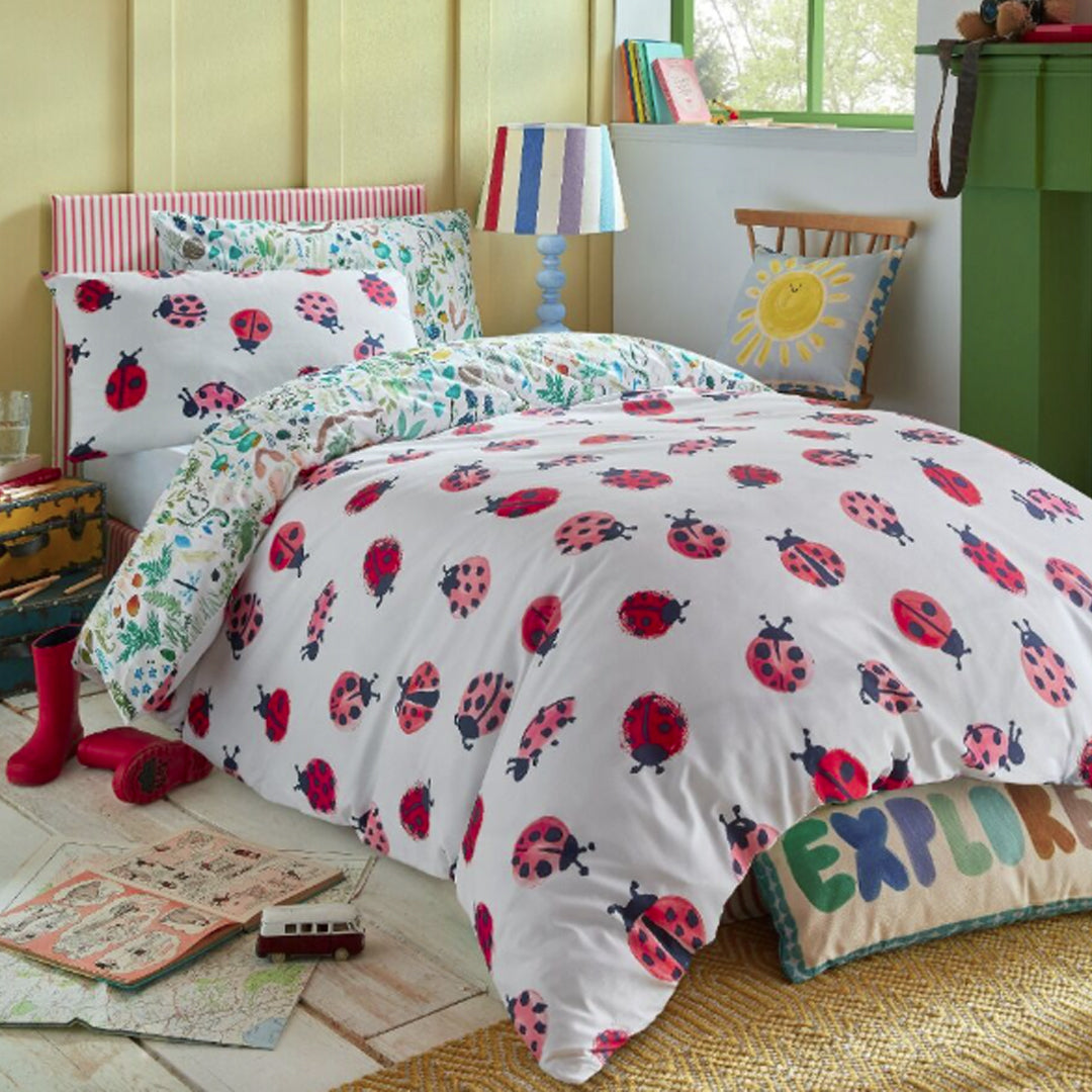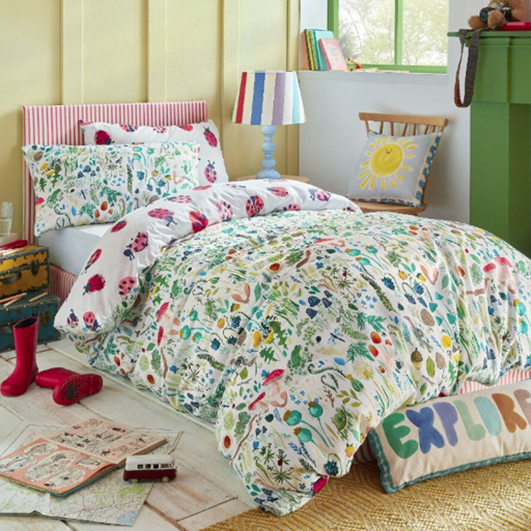 Down the garden path lined with sweet toadstools, and wild foliage, there lived a group of playful and curious frogs - can you find them? This design captures the spirit of a true explorer and forager. This is for the adventurous kids that love muddy puddles, filling their pockets with acorns and climbing trees. The second design of this fully reversible duvet cover features everyone’s favourite friendly ladybirds. Universally loved by gardeners for the good they bring to a garden, ladybirds are also universally loved by children, so it’s a gorgeous pattern to bring to a child’s room. In a joyful palette of soft greens, muted reds, sunny yellows and Printed onto a natural white 100% cotton.