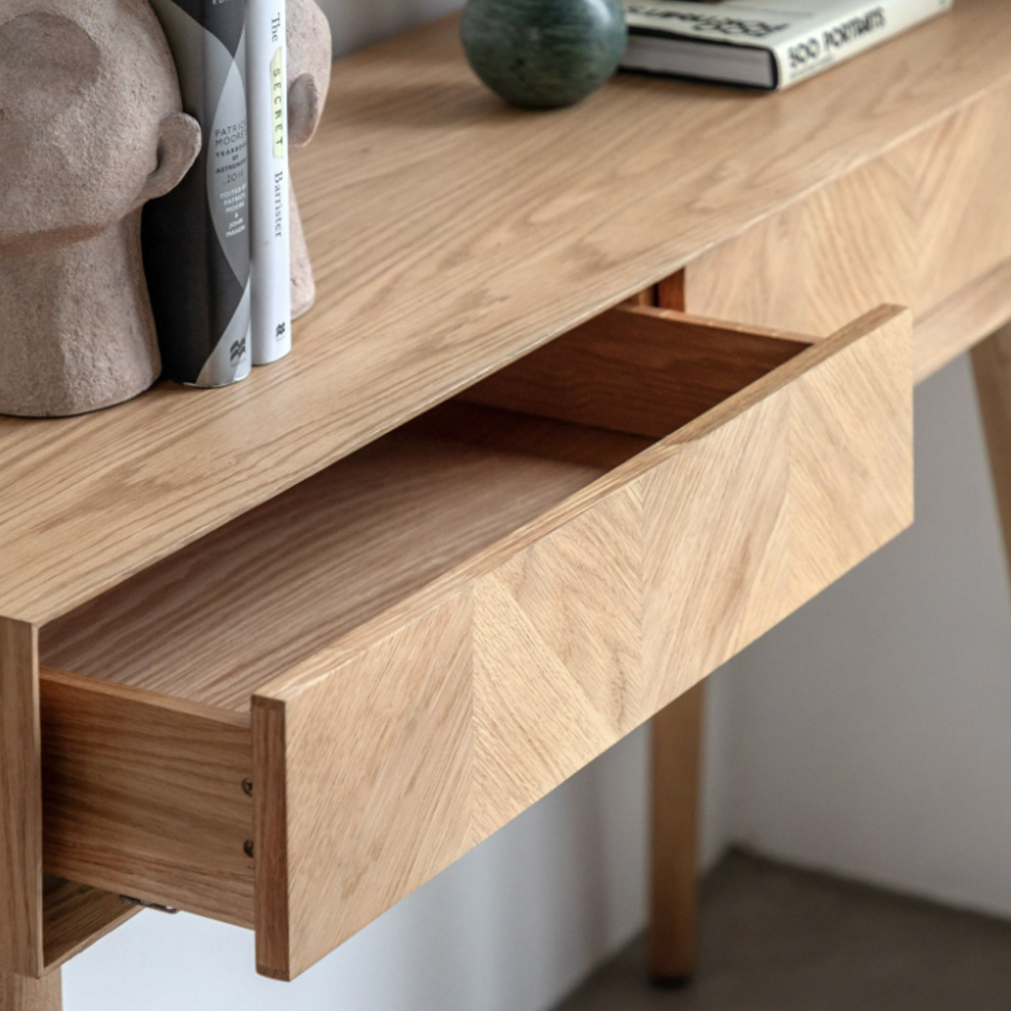 This stunning 2 drawer console table features a beautiful inlay chevron design, and is made using European oak and rustic oak structured veneers which show the natural beauty of the oak grain and knots. Finished in a specialist mat lacquer, which keeps the timber looking natural and dry, with brushed out grain, the table is tactile to the touch and looks amazing. It has 2 drawers for added practicality. The console table can also be used as a dressing table, and looks great with the coordinating mirror above it.