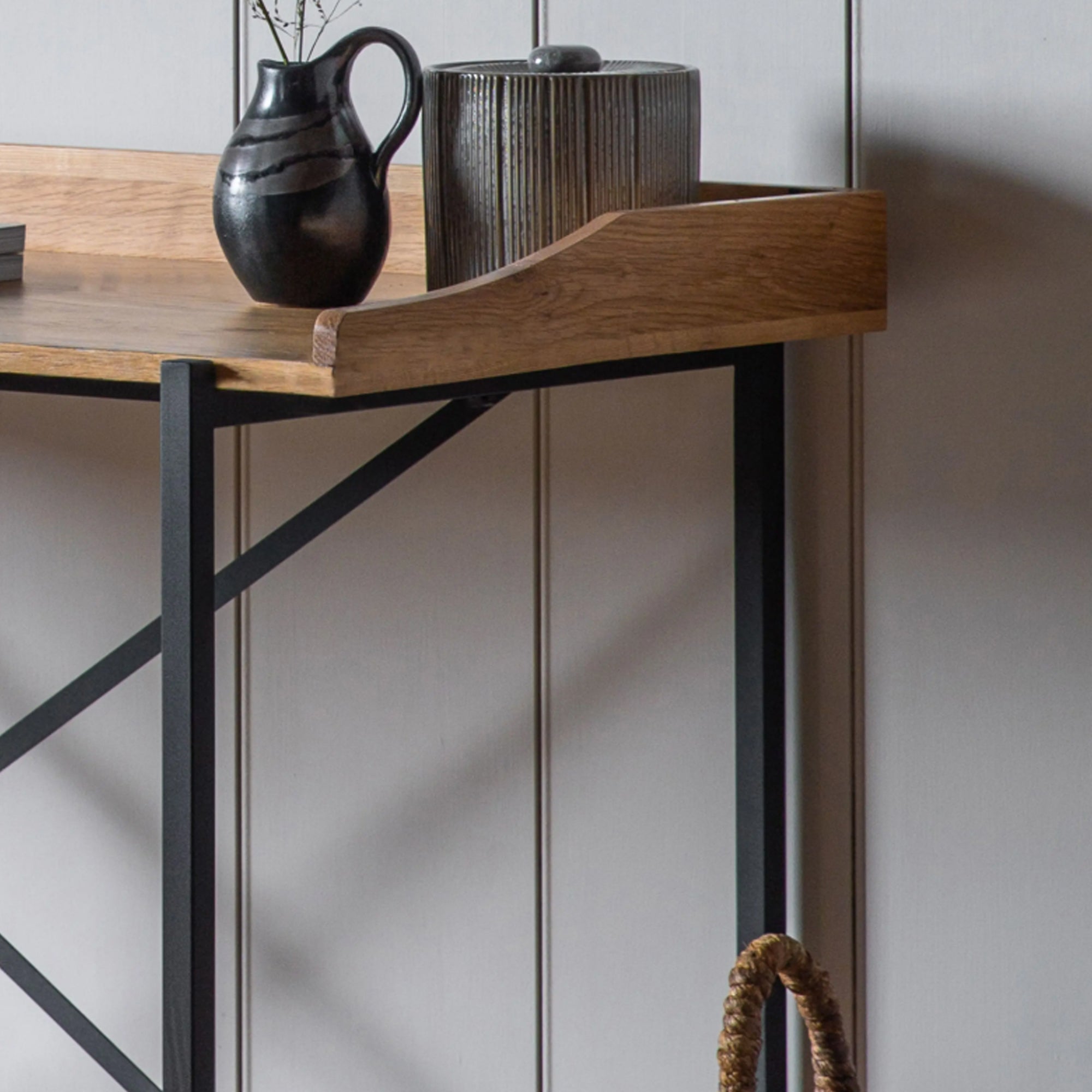 Offering a stunning contemporary look, this desk combines matt black metal with oak. It has an oak veneer top with solid oak surrounds on the sides and back.
