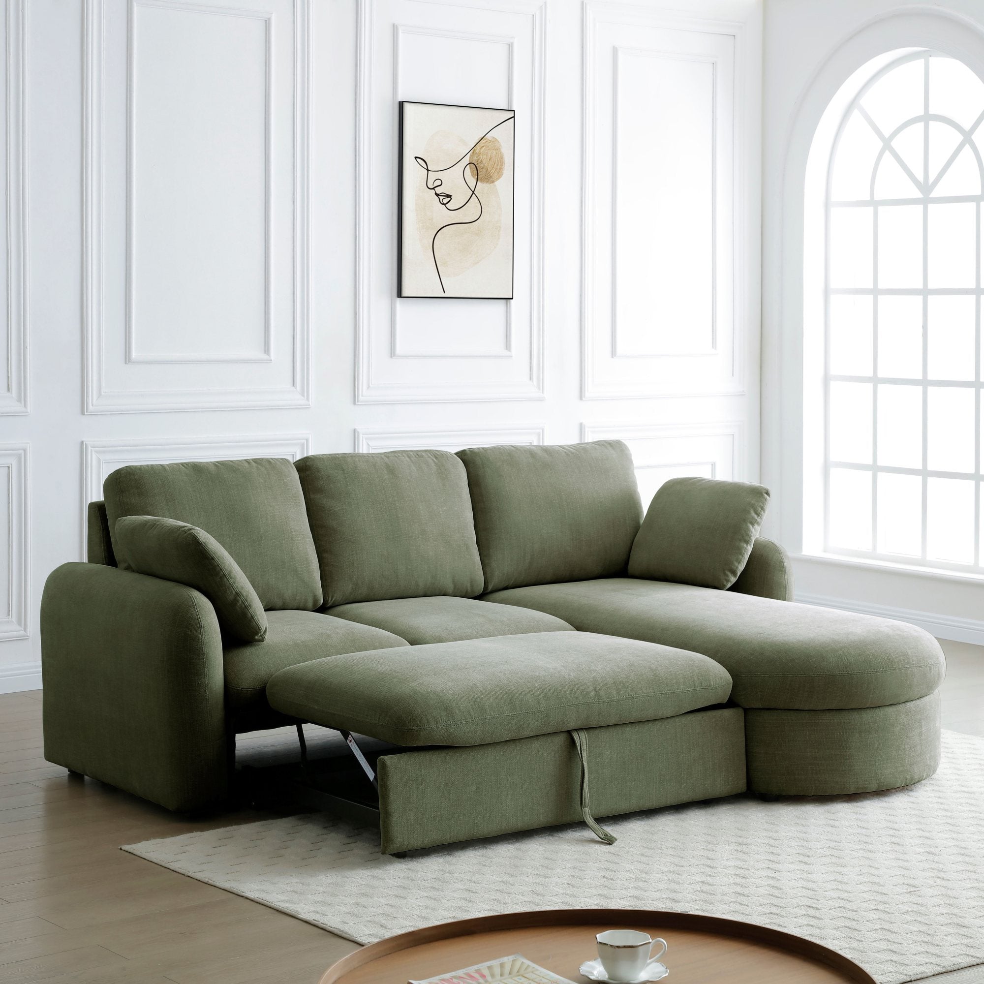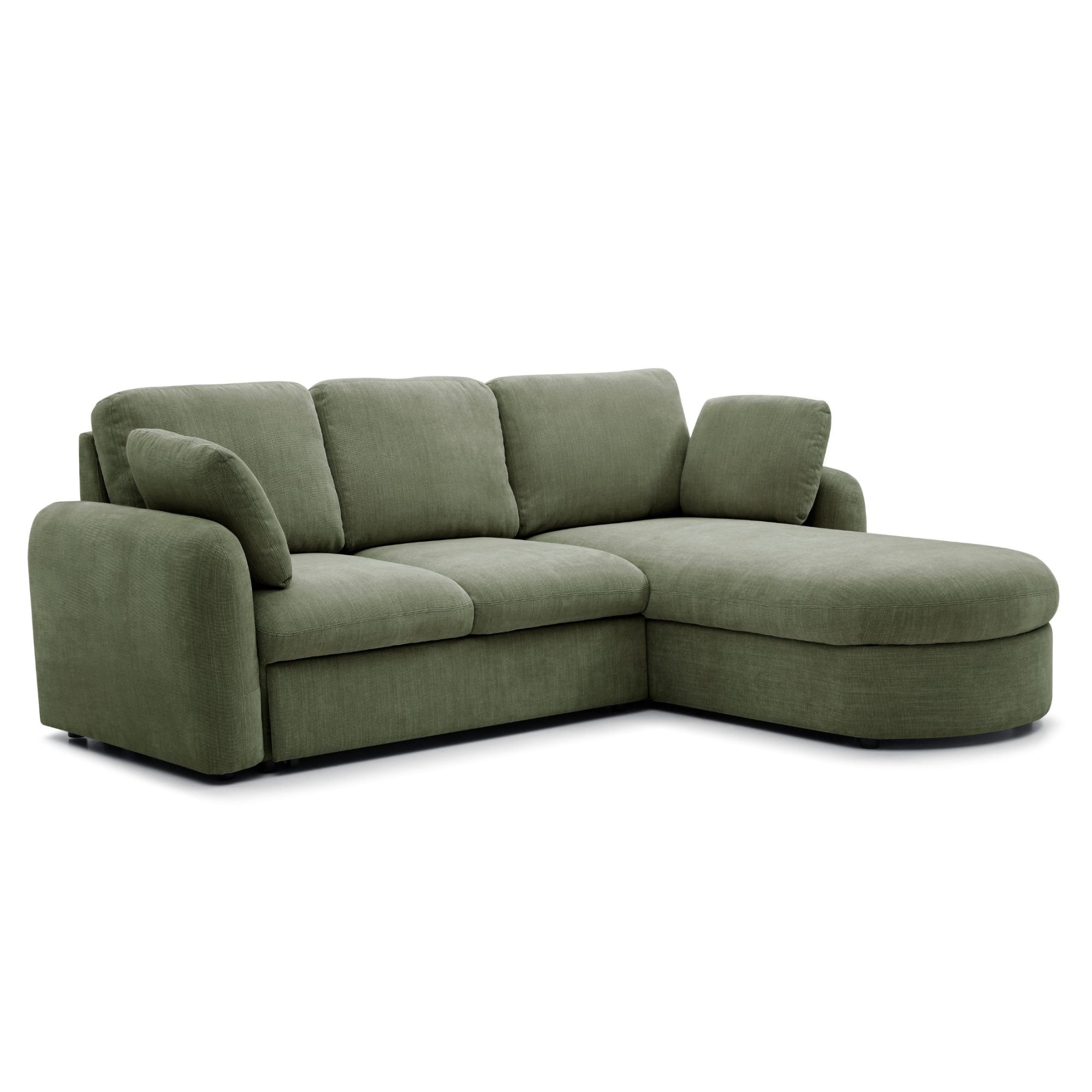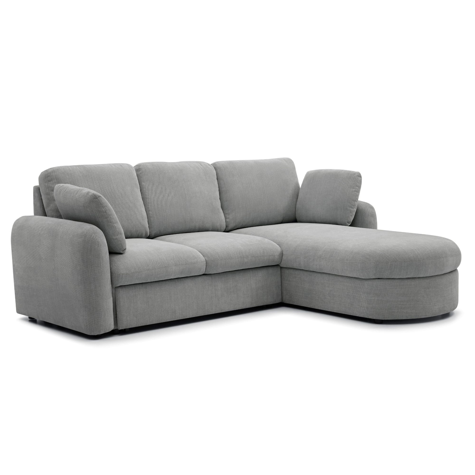 The Mallory sofa bed showcases elegant soft curves along the armrests and chaise, combining style with comfort. With plush pocket-sprung and foam it easily transforms into a spacious king-size sleeping area. Two matching side cushions complete the look, and the beautifully curved chaise conceals a practical storage compartment.