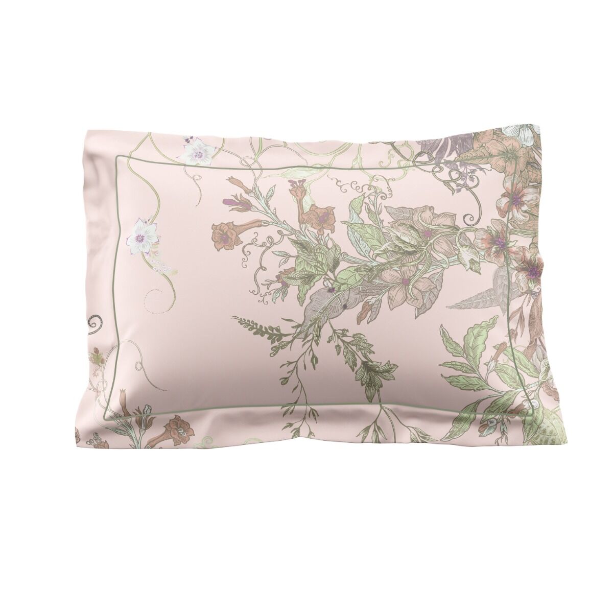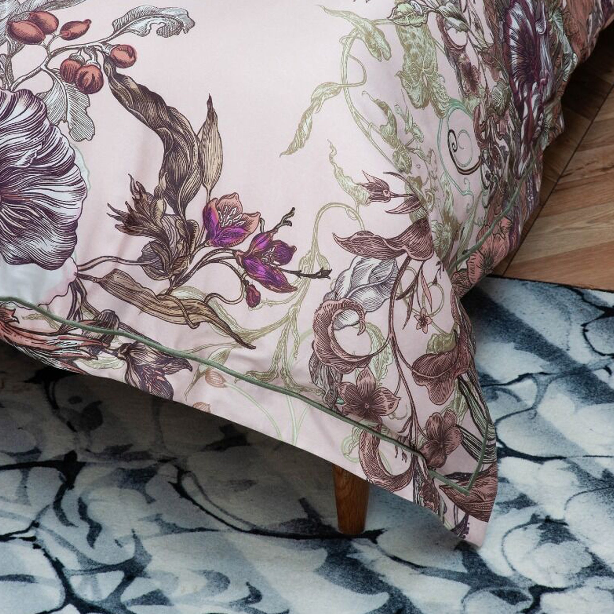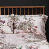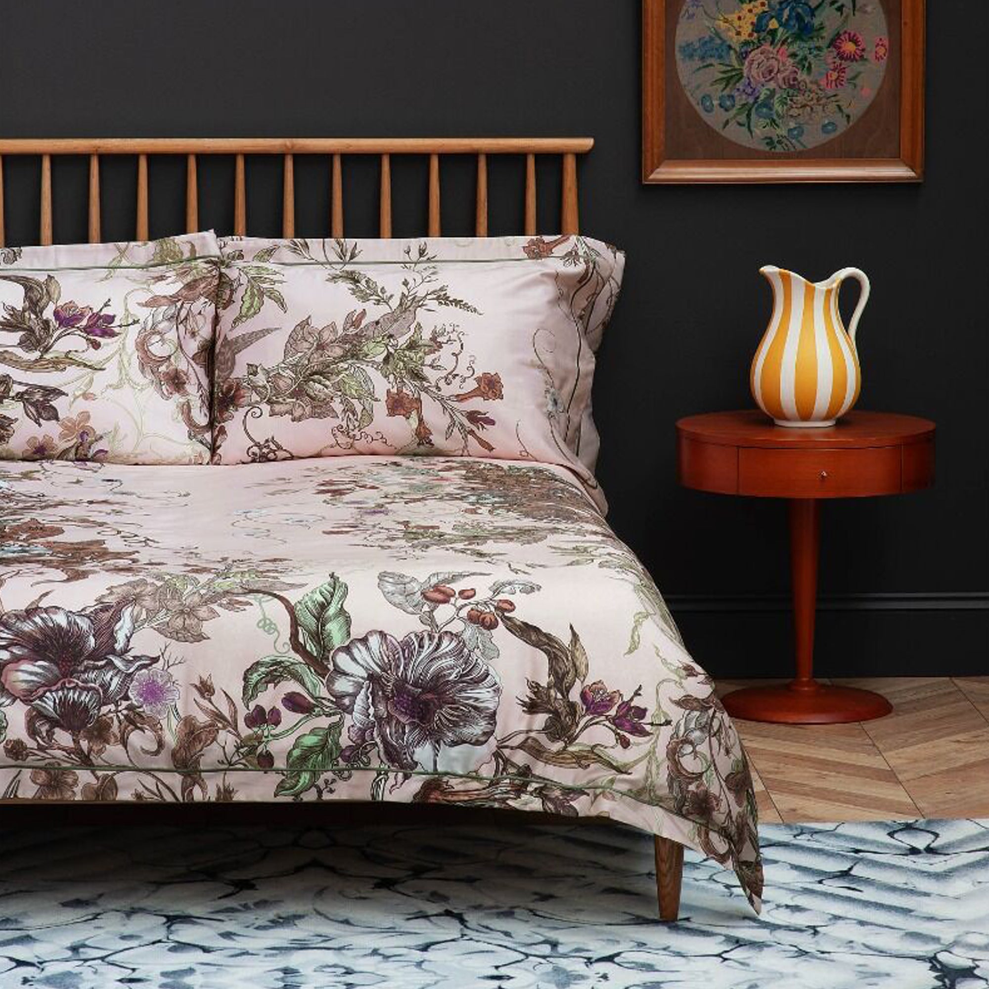 Timorous Beasties Opera Botanica duvet set features a whimsical design with trailing foliage, delicate branches, and soft floral elements, all set against a pale pink background. This bedding combines elegance with comfort, offering a smooth, lustrous finish that enhances the intricate design. Perfect for adding a touch of charm and tranquility to your bedroom.