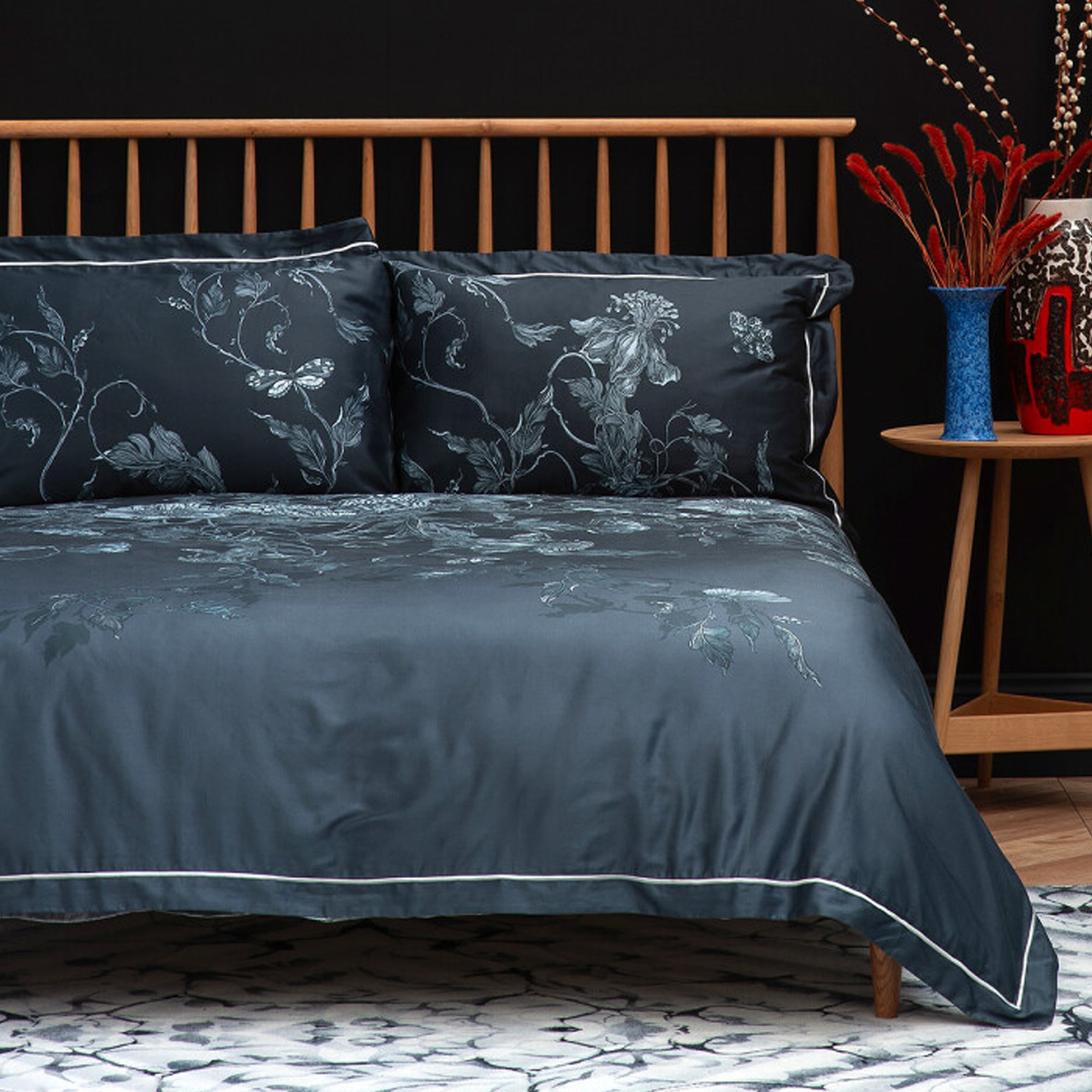 Spill takes its influence from old botanical engravings, re-envisaged to create a bold trailing pattern and luxurious aesthetic. This beautiful duvet set features detailed linework and delicate signature floral motifs. Intricately illustrated butterflies dance around an ever-growing vine in a myriad of deep blue tones on a soft sateen ground. The oxford edge, finished with stunning, embroidered Baratta stitch detailing completes this set perfectly.