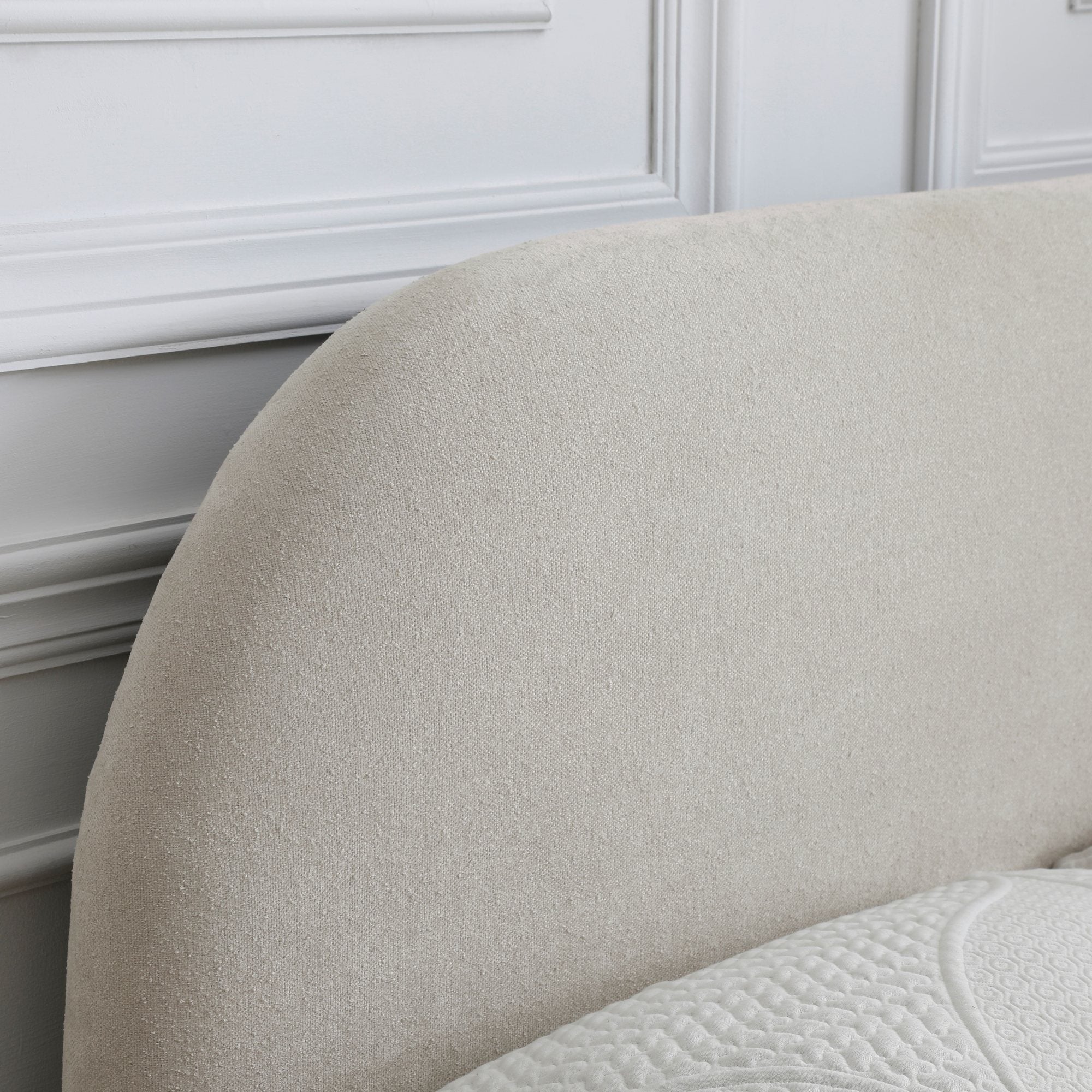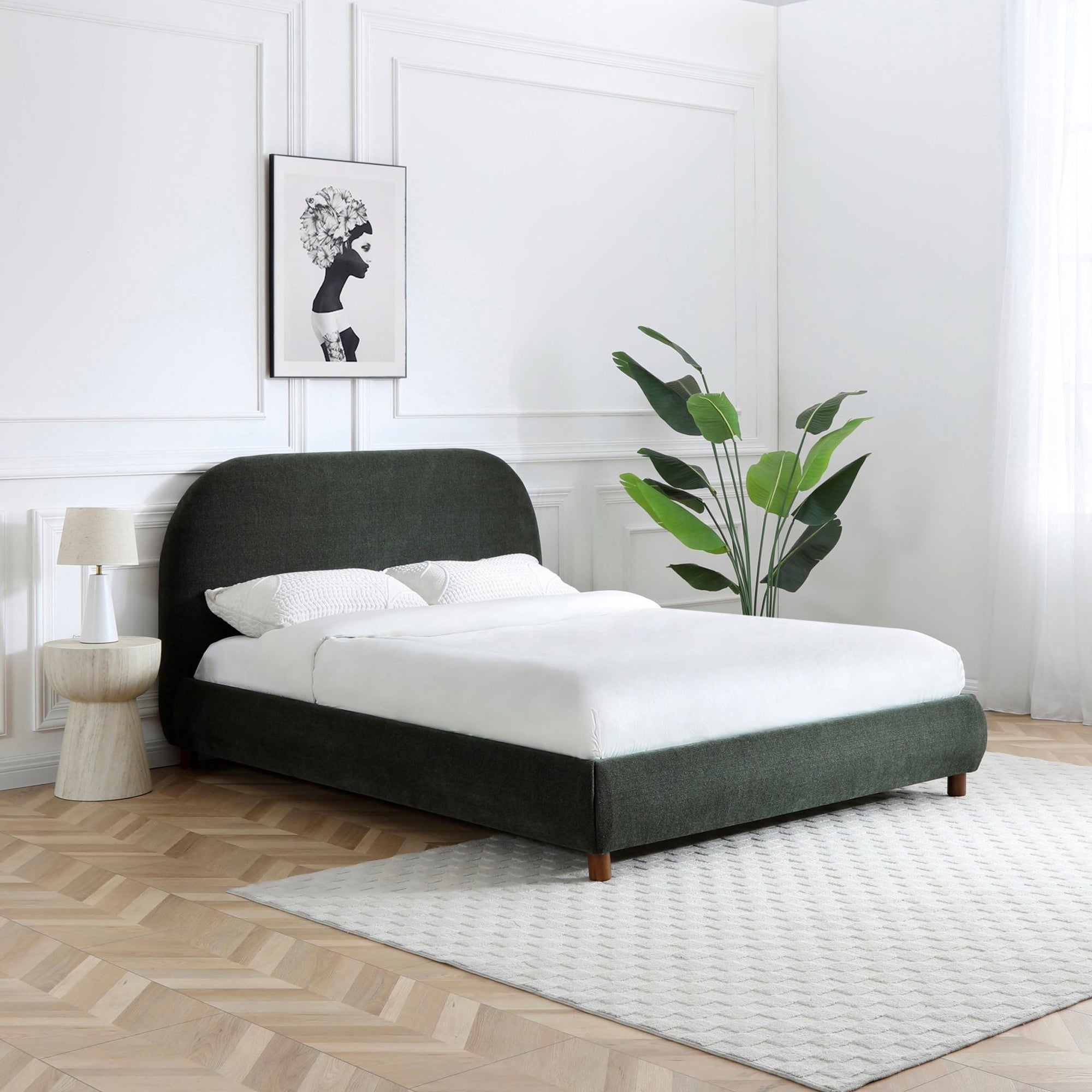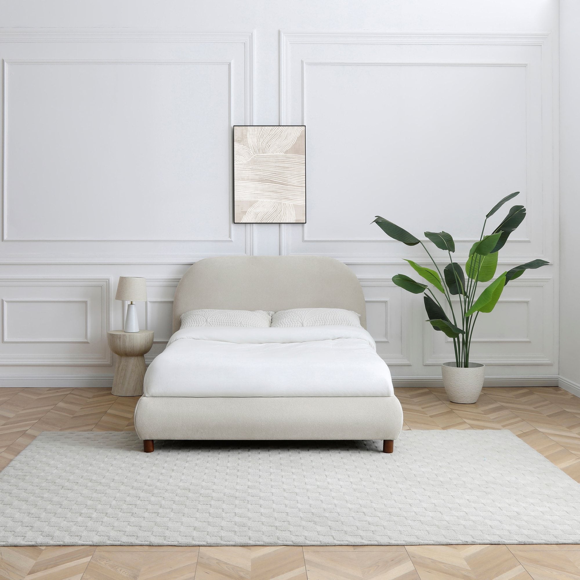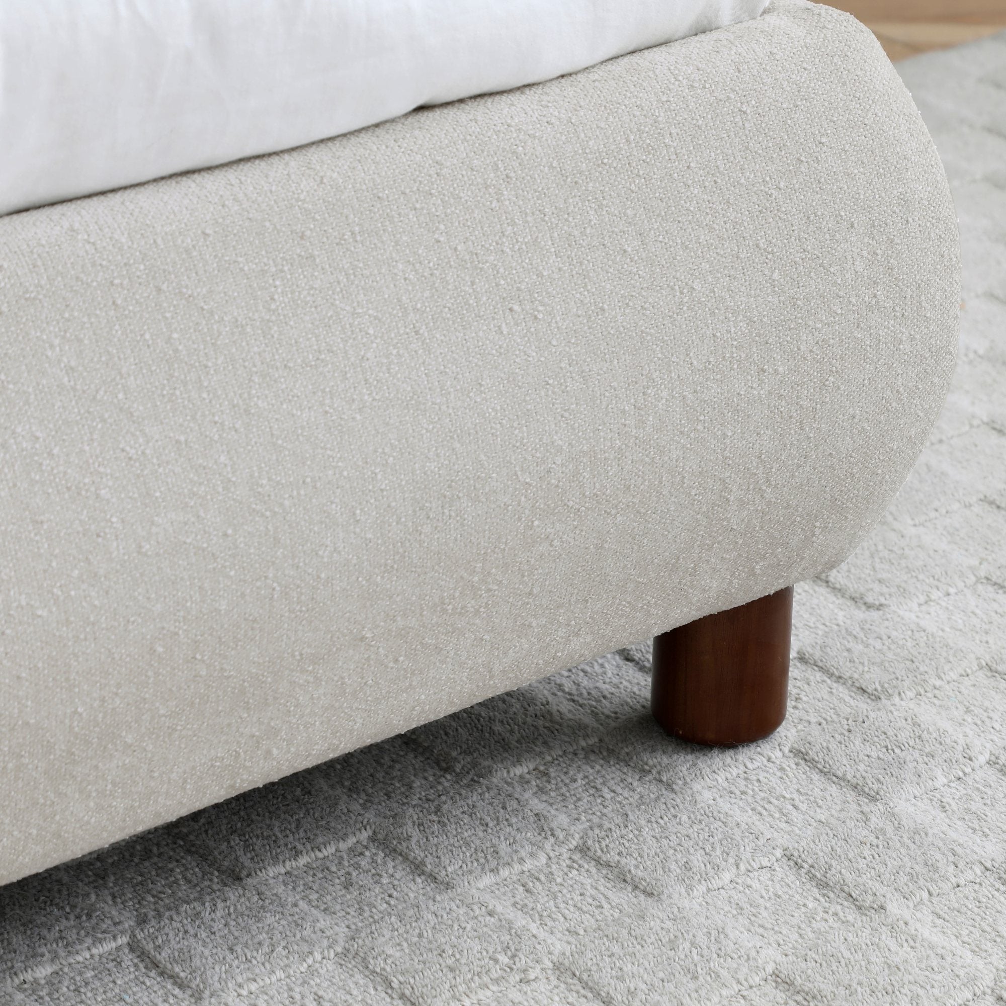 A classic bed frame with a rectangular headboard featuring softly rounded edges. Fully upholstered in textured boucle fabric, supported by contemporary warm wood legs.