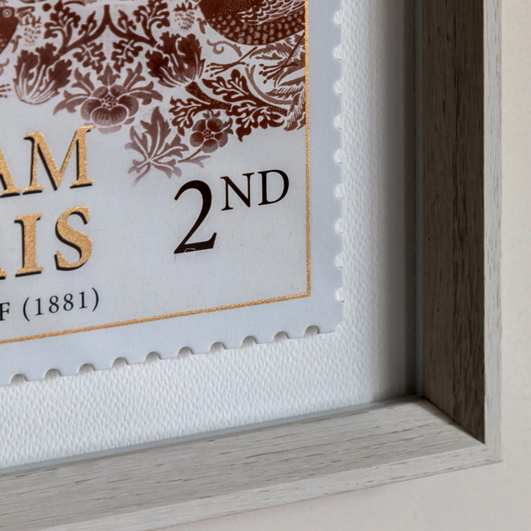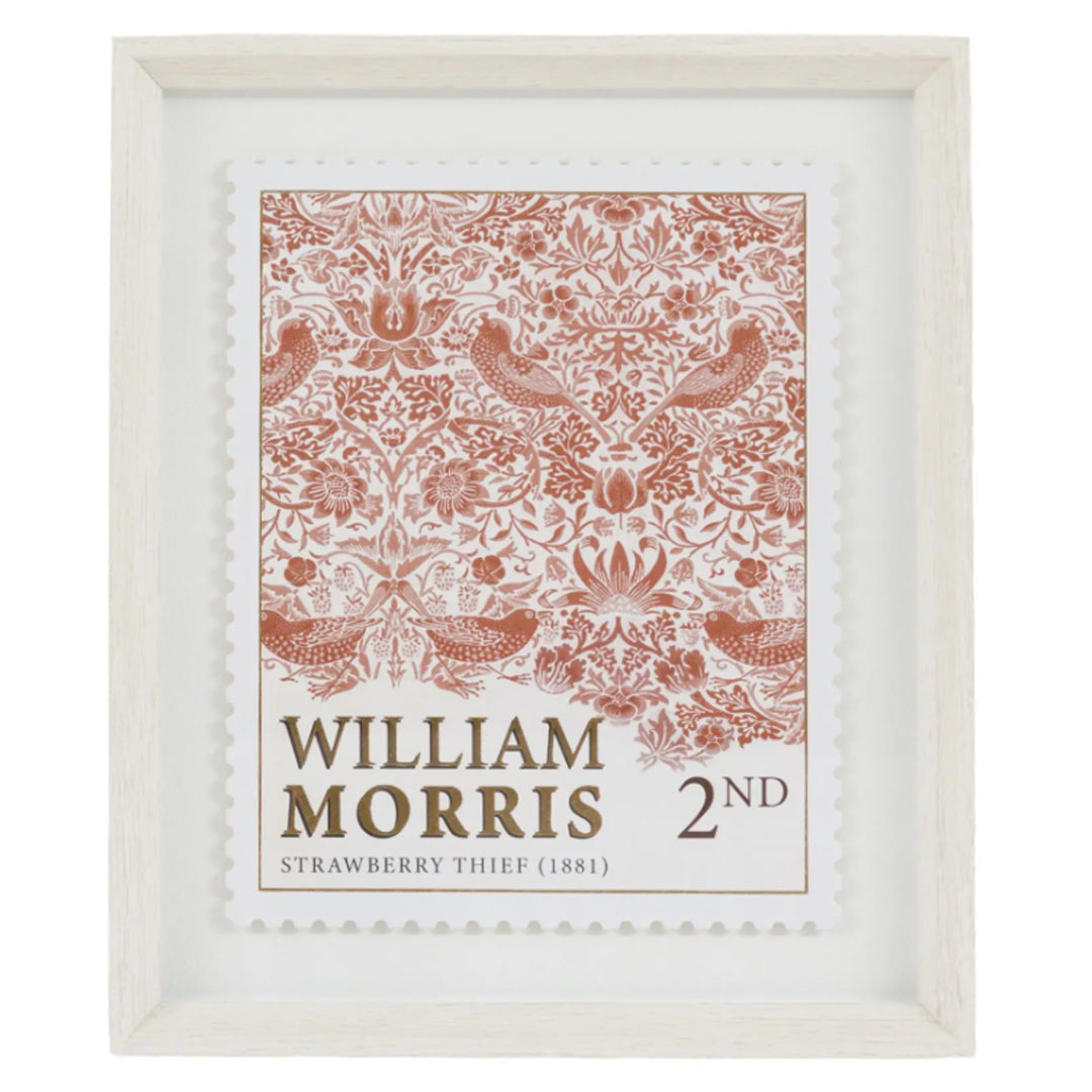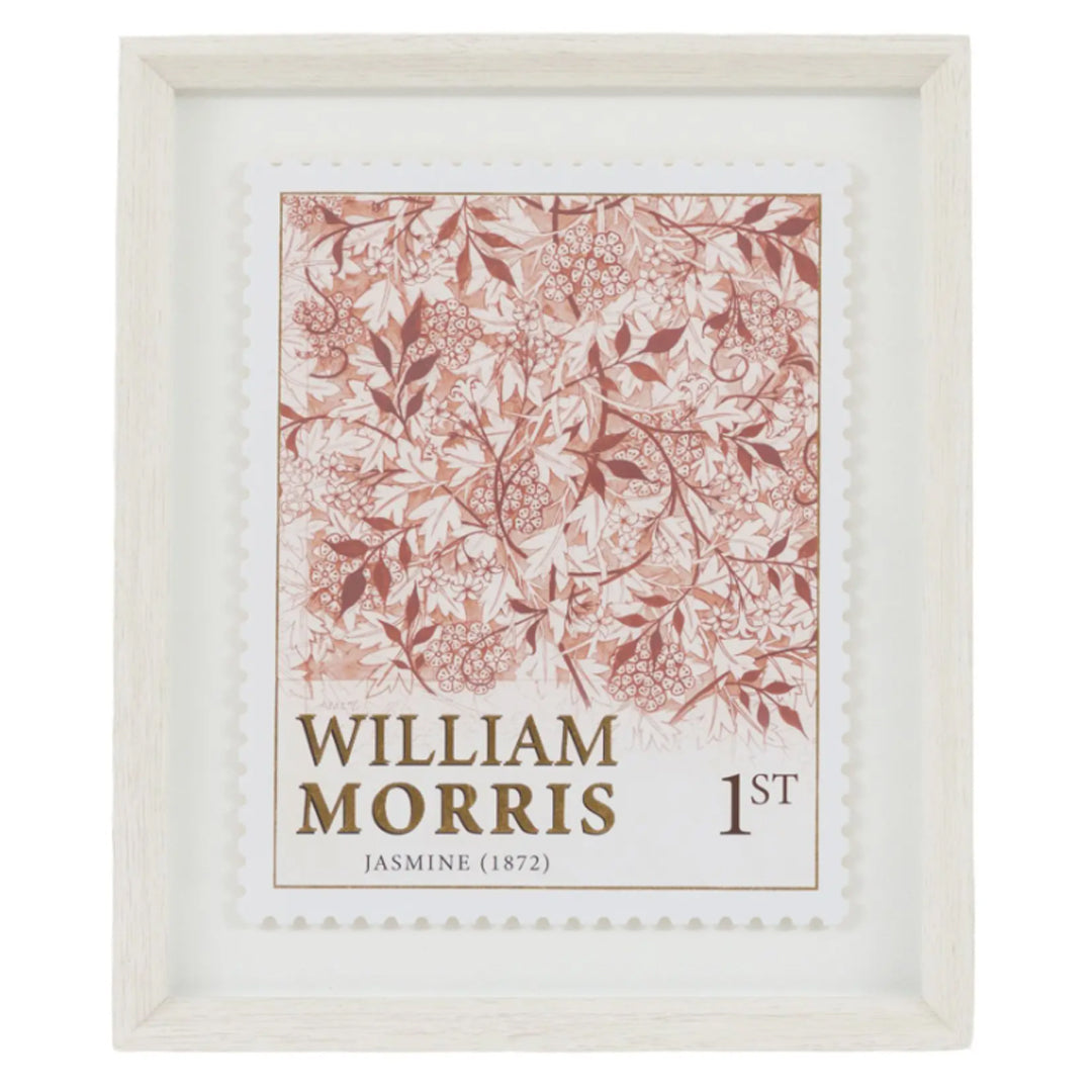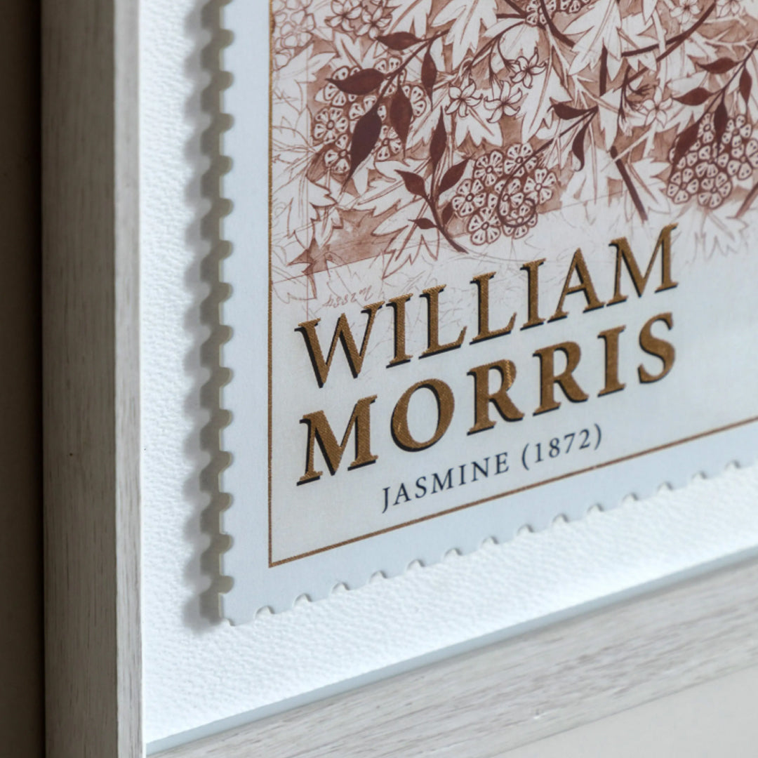 This elegant pair of shadow box artworks celebrates two of William Morris's most beloved designs, Jasmine 1872 & Strawberry Thief 1881, reimagined as exquisite die-cut stamps. Each piece is die cut with perforated edges, raised to create depth and dimension. The typography has been embellished with gold metal leaf for the perfect finishing touch.